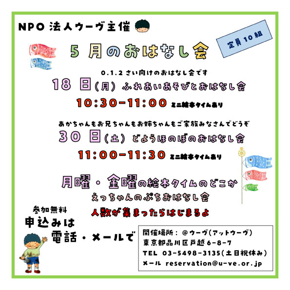 NPO法人ウーヴでは、法人スタッフによる @ウーヴおはなし会を定期的に開催しています♪